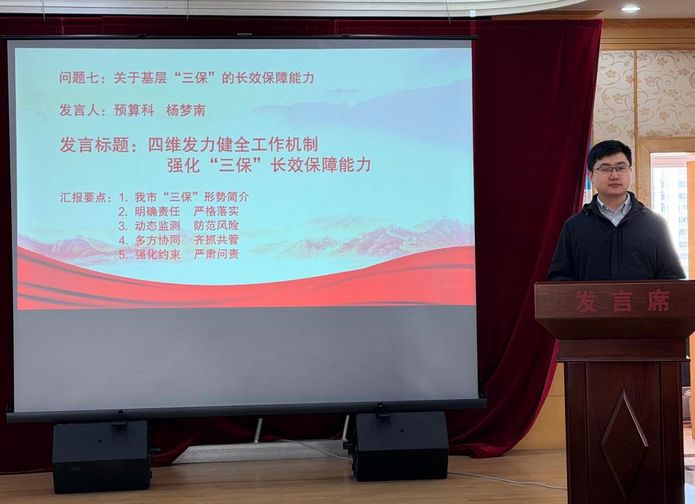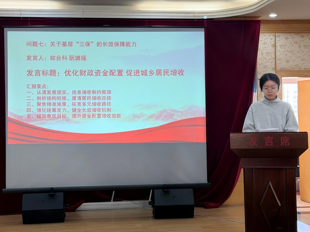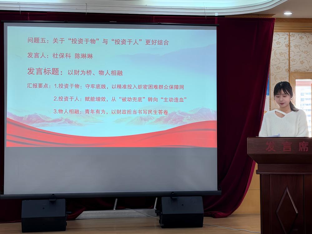 陈琳琳(社保科):一、投资于物:守牢底线,织密困难群众保障网。优化民生供给,推进社区养老、居家适老化改造,推动养老资源下沉基层;夯实就业硬件基础,抓实稳就业民生工程,提升就业服务效能。二、投资于人:赋能增效,实现从兜底救助到主动造血。财政民生优先、资源精准帮扶困难群体,保障救助资金直达快享;整合各类资金开展技能培训,激发困难群体就业内生动力;完善全周期民生保障,强化医保、长护险等民生保障体系。三、物人相融:财政聚力,用心书写民生答卷。立足物基人本、物人相融理念,优化公共资源配置,精准适配人口发展需求,以财政实效助力民生事业、彰显青年担当。