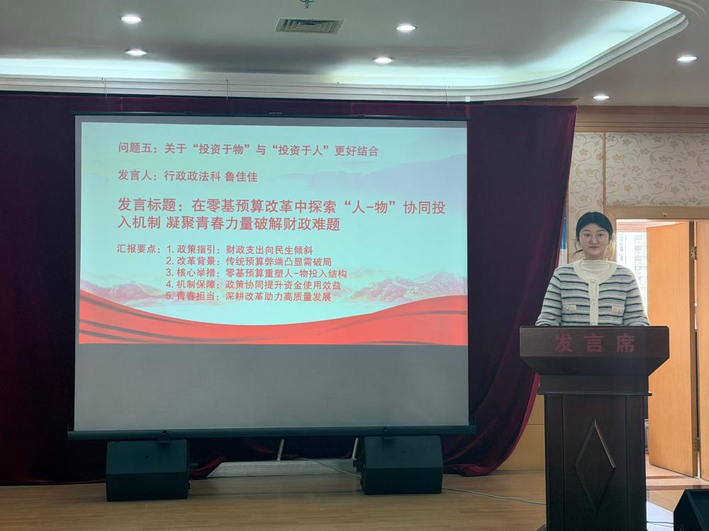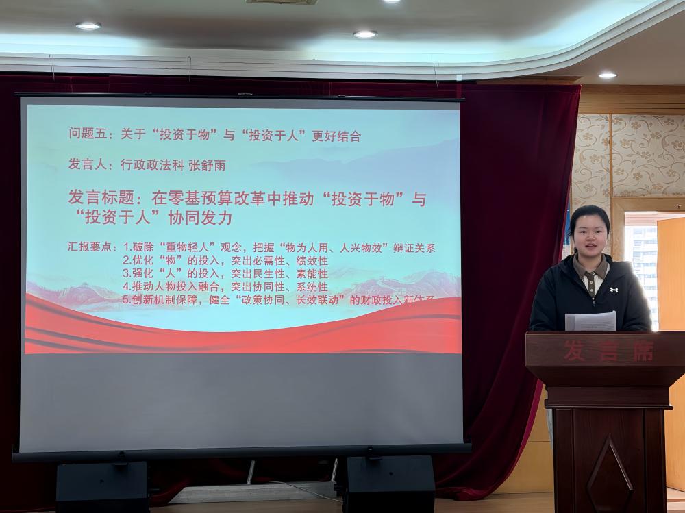 鲁佳佳(行政政法科):本次汇报围绕学习贯彻党的二十届四中全会精神,立足零基预算改革,探索“人-物”协同投入机制。针对传统预算“重物轻人”、资金固化、政策割裂等问题,提出以零基预算为核心,建立“投物+投人”双清单,压减非刚性支出,优先保障一线人员经费与硬件配套。同时,加强跨部门协同,创新资金统筹模式,将绩效评价与“人”“物”成效挂钩。作为青年财政干部,将深入调研、数字化精准调度,践行“过紧日子”要求,持续完善协同机制,推动财力向民生倾斜,助力高质量发展。