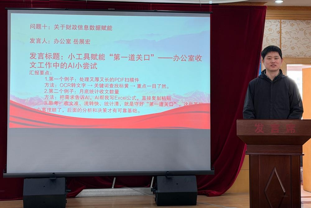 岳展宏(办公室):我是办公室岳展宏,负责收文和文件流转。一开始觉得AI离我很远,但在实际工作中发现,身边的小工具用对了地方确实能帮大忙。一、借力工具,突破重复劳动瓶颈。以往处理PDF扫描件,逐页翻找关键词费时费力。借助文字识别转文本后高亮“财政”“国资”等词,重点瞬间清晰,拟办意见更准。这让我感到,赋能就是从手边工具起步,把机械劳动交给机器,腾出精力做判断、提质量。二、善用AI,跨越专业技能门槛。月底汇总收文,多表格分开统计,手工汇总慢且易错。我不懂复杂函数,便向AI描述需求,它即刻给出公式,数据瞬间呈现,耗时减半。这让我深切体会,AI的意义不是要求人人成为技术专家,而是帮我们跨过技能门槛,让不懂编程的人也能用上智能化手段,把工作干得更扎实。三、立足岗位,筑牢数据赋能根基。文件流转看似小事,却是财政信息传递的第一道关口。登记准不准、流转快不快、统计清不清楚,直接影响后续分析和决策的可靠性。把基础环节理顺做细,就是为数据归集和信息畅通筑地基。AI赋能不在远近在点滴,立足岗位把工具用对、小事做实,每个人都能成为工作链上的赋能点。