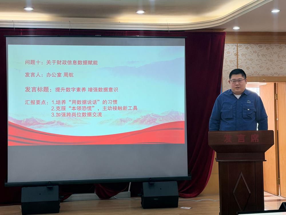 周航(办公室):本材料围绕提升数字素养与数据意识,分享了三点思考:一是养成“用数据说话”的习惯,从被动记账转向主动追问数据背后的趋势与异常;二是克服“本领恐慌”,从基础操作入手逐步掌握数据分析工具;三是加强跨岗位数据交流,打破财务与业务科室之间的信息孤岛。总之,数据意识需要在日常凭证审核、报表编制中持续沉淀。作为青年干部,应当从自身做起,让数据真正成为辅助决策的有力依据。