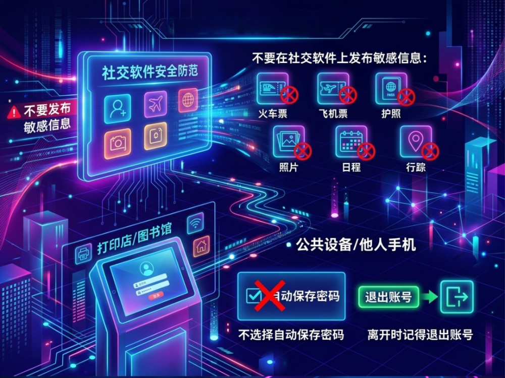 不要在社交网站类软件上发布火车票、飞机票、护照、日程、行踪等;在图书馆、打印店等公共场合,或是使用他人手机登录账号,不要选择自动保存密码,离开时记得退出账号。